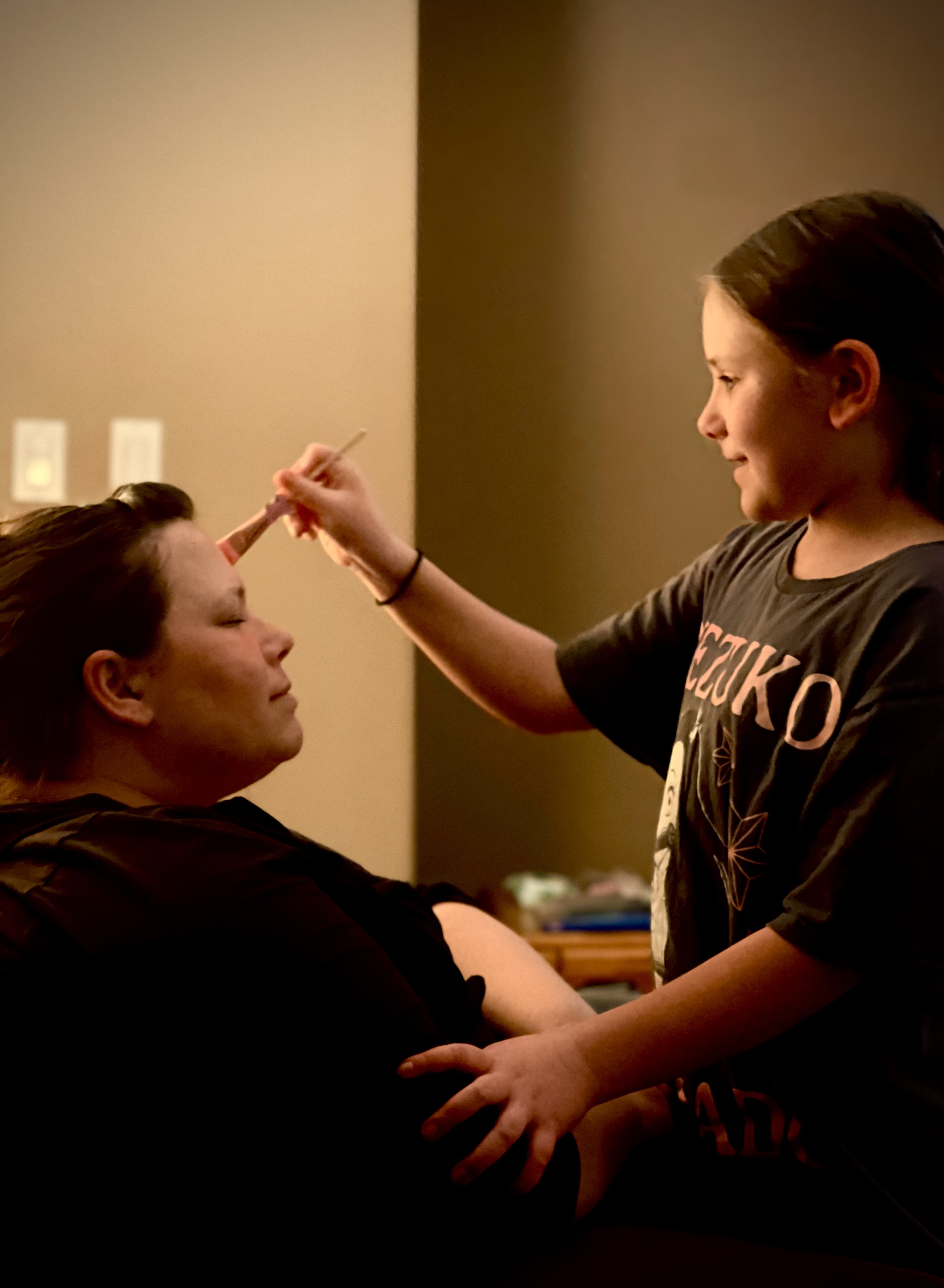 The crazy thing is, all the play actually is practice and she actually is getting good at it. She did my makeup the other day and it was surprisingly artful. Thick, sure, and did I need quite so much highlighter, I’m not sure, but I was overall impressed.