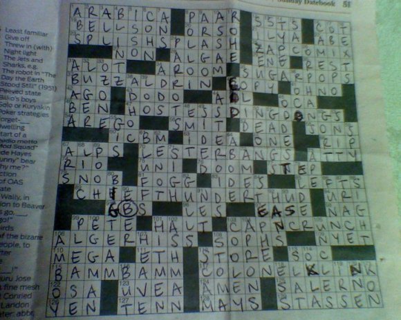 And who would have expected that this would be the show that a) has me working the hardest out of the 3 shows I’ve done at Marin, or b) we could really use another crew person backstage? There are numerous set changes, and while the actors do a lot of the work, I spend quite a bit of time onstage looking rather out of place and trying not to make eye contact with anyone in the audience. But I’m just grateful they didn’t want to costume me. When I’m not onstage, I am most likely moving around quickly backstage, unless it’s the second act in which case I have a half hour break that I usually spend doing a crossword puzzle. Sometimes a Cryptogram.