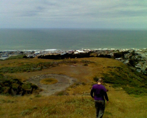 Today it’s semi-nice out, and we went for a walk. Milagra Ridge is a nice place to walk, it’s got great views, it’s not super difficult but it’s also not totally flat. There is also a WW II bunker (or maybe more than one?) and that’s interesting. Today we climbed over the “fence” that separates the walking paths from the wilderness part, and climbed all over the bunker.