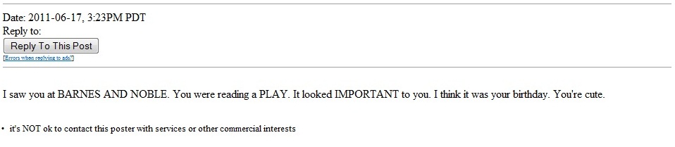 MISSED CONNECTION…I’ve never had a missed connection before! (Missed Connections is a section on Craigslist where you can put up a message for a stranger, maybe someone with whom you exchanged a meaningful glance on the street, in the hopes that they’ll read it and email you and you can fall in love. Or whatever.)