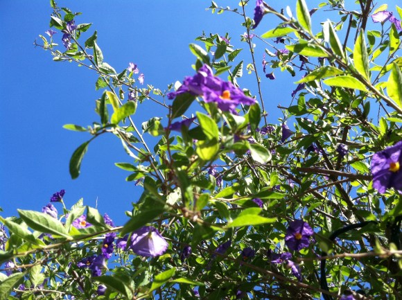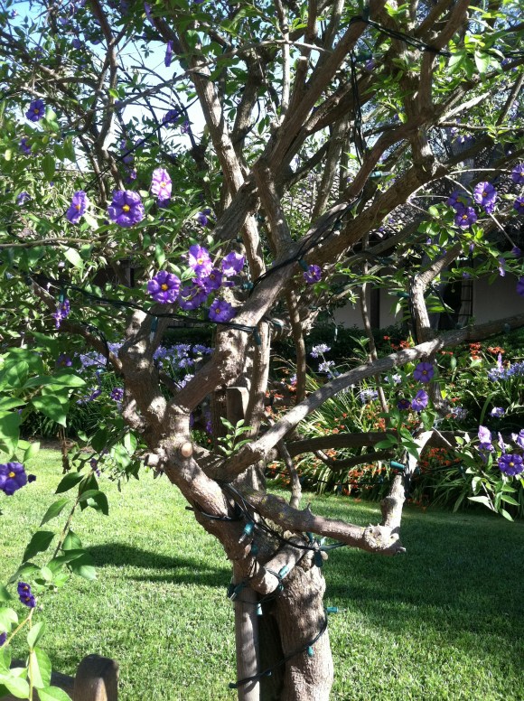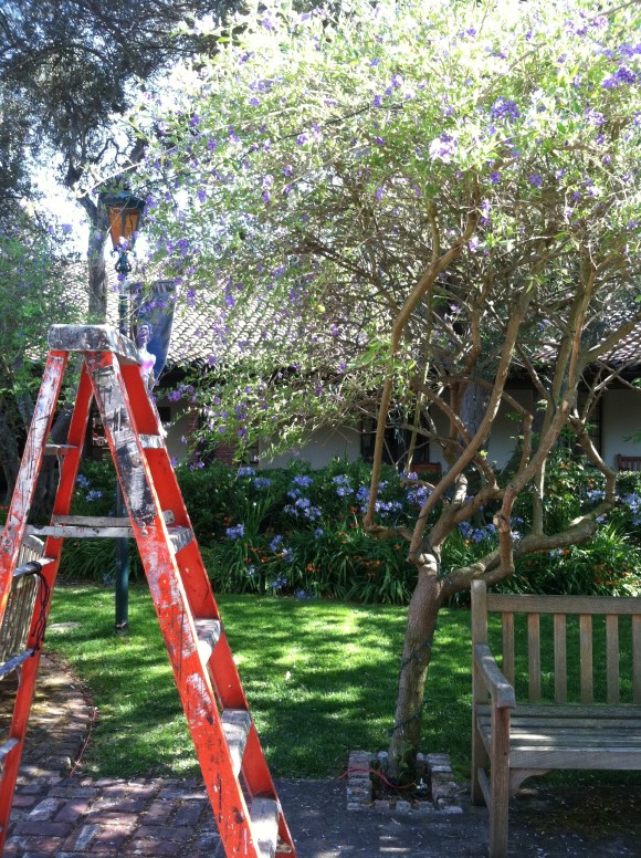 working with the scary, scary 6′-ladder and the towering, monstrous pretty purple trees, and the muy peligroso twinkle lights. I stayed off the ladder as much as possible and just climbed around on the benches under the trees. No biggie.