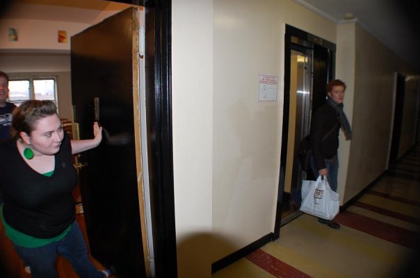 That's our door! And the elevator! And Erin excited that Joe is arriving.