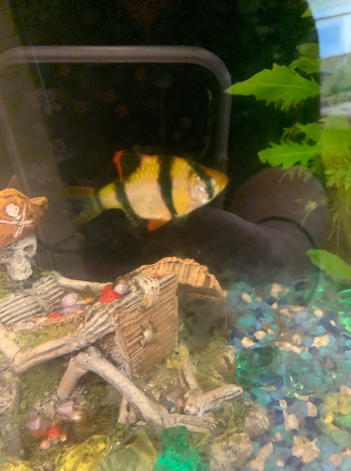 What’s kind of funny is that when I got Tiger and Fifi, as I was leaving the Petco parking lot, they were in their bags on the passenger seat next to me, and then a car in front of me in the parking lot stopped inexplicably, and I slammed on my brakes, and both fish bags went flying into the footwell. (Oops…) And then when we were putting them into the tank, Tiger escaped and jumped into the back part of the tank where the filter is, and I had to scoop him out with my hand, and I almost crushed him against the filter. So like, maybe this fish is invincible. Three months later, he’s still going strong. So strong, in fact, that we sometimes wonder if he might have bullied the other two into dying. Tiger barbs are aggressive…
