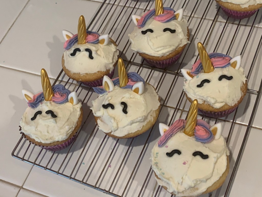 So H and I baked unicorn cupcakes, because I already had the decorations stashed in the pantry, and she’s been talking about wanting to do more baking together.