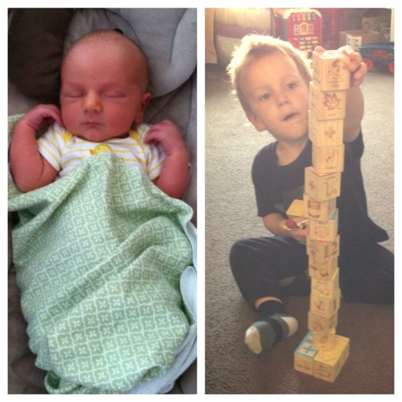 He is turning into such a little boy. Yesterday during his bath I told him I’d get him a certain toy if he could use his bath crayon to draw a circle – and he did it, no hesitation. He adores his baby sister: I found him in our bed with her this morning, tucked in. He wakes up every morning with a huge smile on his face. He loves the alphabet, counting, animals, books, and airplanes.