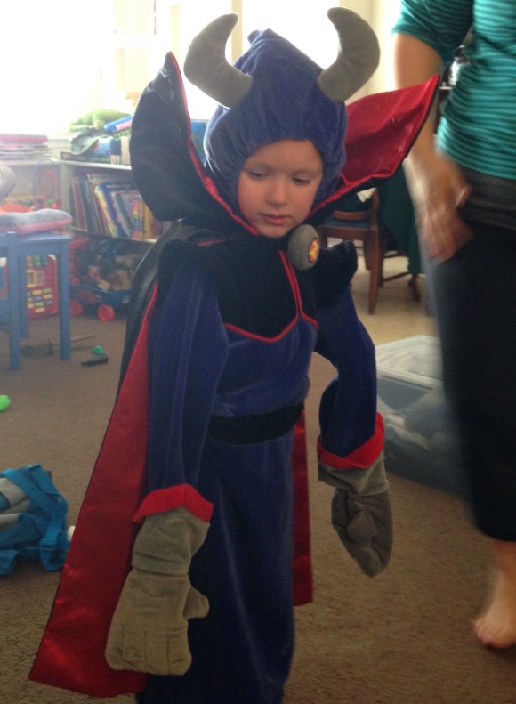 I recently mentioned B’s repeated desire to be Emperor Zurg from Toy Story 2 for Halloween…and another mom in the group said she just happened to have a costume from when her son was 4 and obsessed with the movie. She was gracious enough to mail it to me, where I tried to force it onto my son, who was now repeating “No Zurg, nope, nope.”