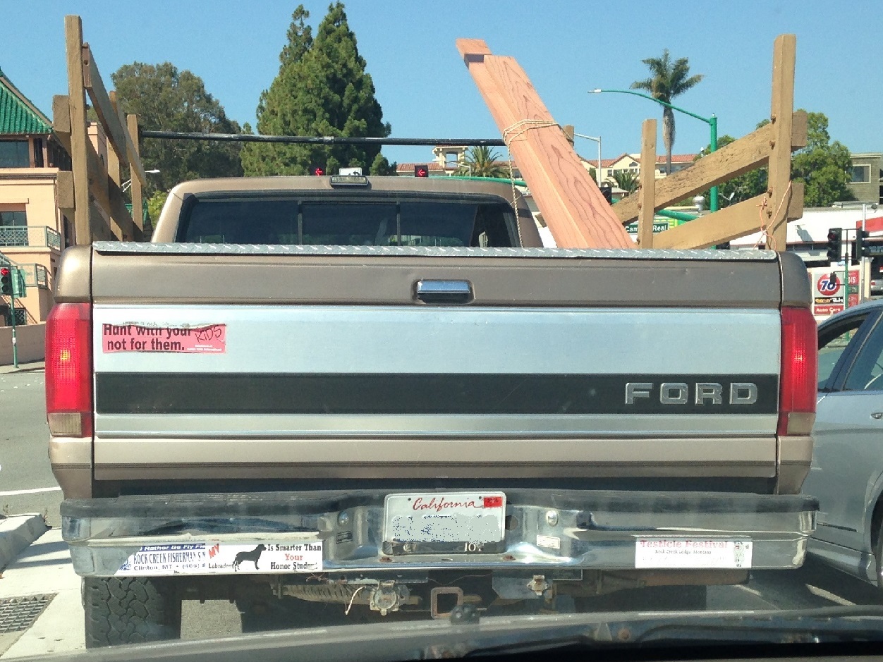 I kept getting stuck behind this truck today, and I was absentmindedly reading the bumper stickers, thinking, This is why I don’t get bumper stickers, because I really don’t know what I would want to use to showcase my personality to all the drivers around me. Then I realized that this person is kind of the exact opposite of me.