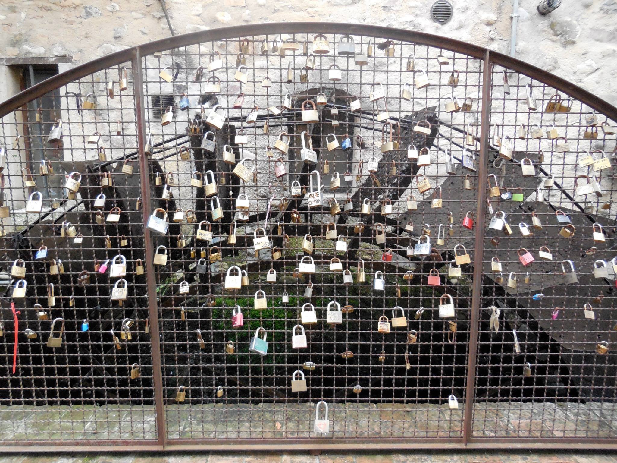 I have a vague memory of hearing about this phenomenon before, but thank goodness my uncle posted a link to the Love Lock wiki page, so I could refresh my memory. You write your names on a lock, fasten it on a fence, and then pitch the key into the river – because your love will never be undone. (It’s a little cheesy, but I think that kind of stuff works in Europe and in the Napa Valley.)