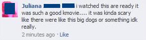 Uggghhhhhh…this comment really bothers me for some reason. I think it’s partly the combination of absolutely no punctuation (except for the 4-dot ellipse), spelling errors (kmovie), text speak (idk), and blatant ignorance (“are ready” = “already”). But the icing on the cake is that “there were like this big dogs or something,” but, despite this being the climax of the movie, she didn’t really get what was going on.